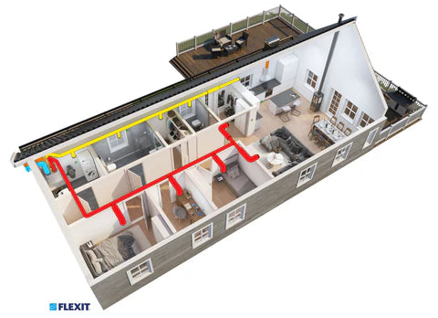 Gjennom et balansert ventilasjonsanlegg kontrollerer man både mengden tilluft ogavtrekksluft, til forskjell fra et sentralavtrekk der man bare kontrollerer avtrekksluften. Ventilasjonsaggregatet består av en vifte som trekker ut brukt luft fra våtrom, kjøkken og tekniske rom. Det består også av en vifte somtrekker luft utenifra og tilfører frisk, temperert luft til oppholdsrom, som soverom, stue og kontor. Tilluften passerer pollenfilter i aggregatet, innen den føres ut i oppholdsrom. I ventilasjonsaggregatet gjenvinnes varmen fra den brukte luften og overførestil tilluften. Dette gjør at den luften som føres tilbake til oppholdsrommene er oppvarmet.
