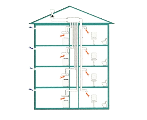 I noen blokker og borettslag benyttes det ventilasjon av typen Fellesanlegg. Fellesanlegg betyr at det er en stor motor, gjerne på taket av bygningen, som trekker luft fra alle boenhetene.